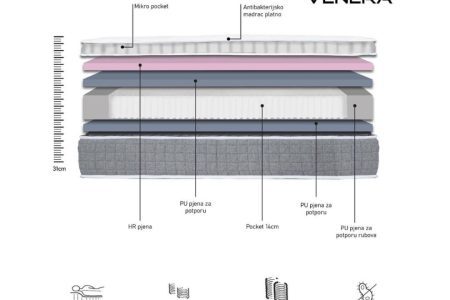 Madrac sa nadšivenim nadmadracem je izrađen od visokokvalitetnih materijala te dolazi uz krevet. U madracu se nalazi džepićasto jezgro koje pridonosi udobnosti i dugotrajnost madracu. Nadšiveni toper presvučen u antialergijsko platno, sastoji se od Memory pjene tako da se madrac prilagođava vašem obliku tijela.